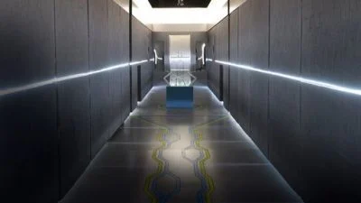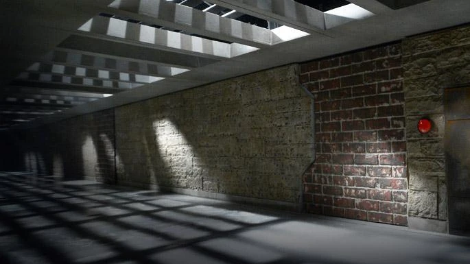 "To exit this room, team members will be locked into holes in the wall, until they have solved 5 visual puzzles. Once complete, one team member will be released to retrieve the 1st plasma key from the keybox. The key must be placed in a slot on the wall to open the doors to the hallway, but the walls will begin closing in. If you make it through safely, the doors & hallway will reset, and your teammate will be released to escape with the 2nd key, before being 'crushed'."
