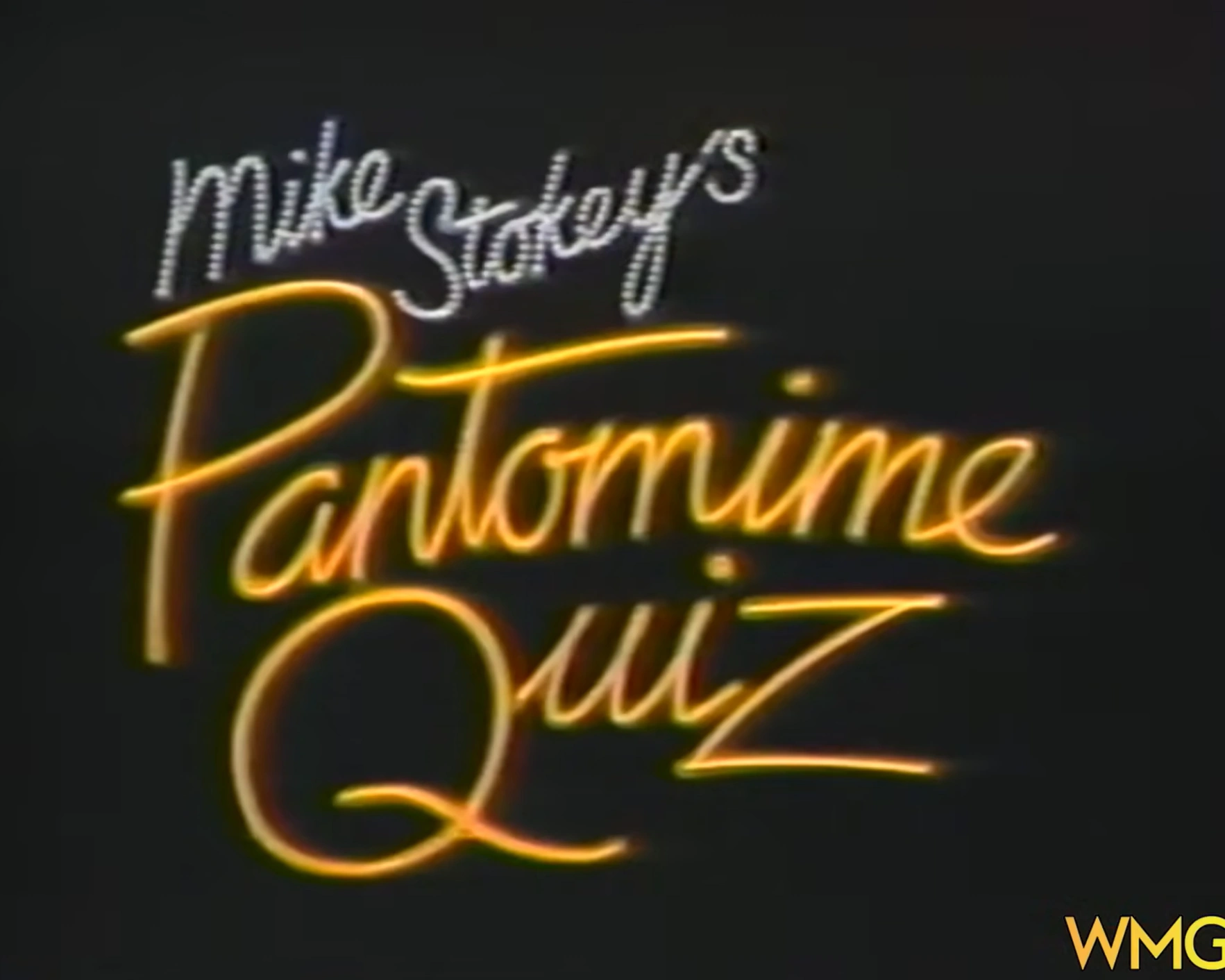 1983 PILOT SPIEL: "You're panting? Pant? Ohhh? Me? My? Mine! It's Pantomime Quiz time! From Hollywood, it's the favorite game of the Hollywood stars, it's Mike Stokey's Pantomime Quiz! And now, here's your host, Mike Stokey!"
